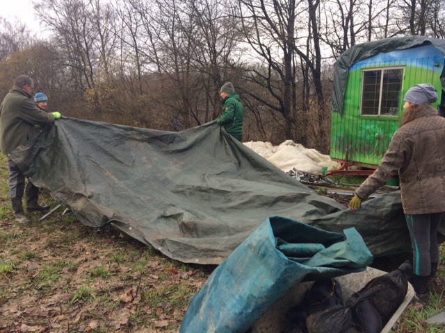 Marco Heisiep und Lukas Ezzedine haben den Tunnel in tausend Einzelteile bei einer Kräutergärtnerei in Niedersachen zerlegt, das Ganze in einen üblichen Transporter gesteckt und nach Witten gefahren. Tags drauf wurde erstmal ausgeladen. Da der Ackerboden durch den vielen Regen sehr weich war, ging es nur in Handarbeit und zu Fuß. Nach nach zwei Stunden war es geschafft! Vielen Dank allen helfenden Händen für Abbau, Transport und Lagerung. Im Februar geht es weiter.