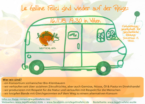 Die Entwicklungsgesellschaft will sich diese Möglichkeit näher anschauen und hat dazu die Glücklichen Hühner - Le Galline Felici - am 16. November 2018 um 19.30 Uhr nach Witten in die Steinstraße 5 eingeladen. Einige Mitglieder dieser sizilianischen Erzeugergemeinschaft machen sich einmal im Jahr auf den Weg Richtung Norden und besuchen Einkaufsgemeinschaften und Interessenten, jetzt kommen sie auch nach Witten. Bitte findet unter diesem >>LINK mehr Informationen zu den Glücklichen Hühnern.